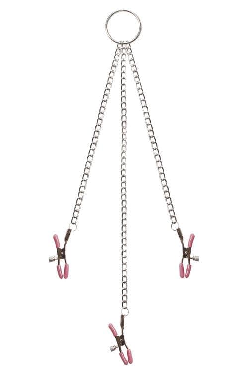 Metal chains naturally pull the clamps down, but give the central o-ring a cheeky little tug for more intense sensations.