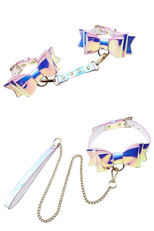 This enchanting 5-piece collection brings a sweet-meets-kinky twist to your bedroom fun. Complete with a bow-tie collar, matching wrist cuffs, a leash, and a cuff connector, this set is designed to make your sub look as magical as they are submissive.