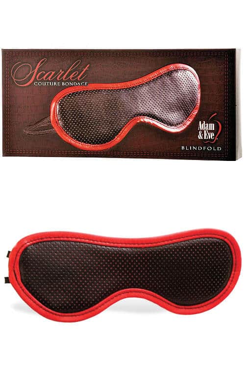 This sexy blindfold is made from black vegan leather with red trim, and features light padding as well as a soft satin inner lining.