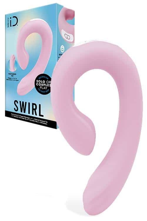 The Swirl is a double-ended vibrator that provides internal and external clitoris to people with vulvas, targeting the G-spot and clitoris. It’s C-shaped design makes it great for penis owners, who can use it as a vibrating stroker with deep, rumbly vibrations that feel great on your shaft.