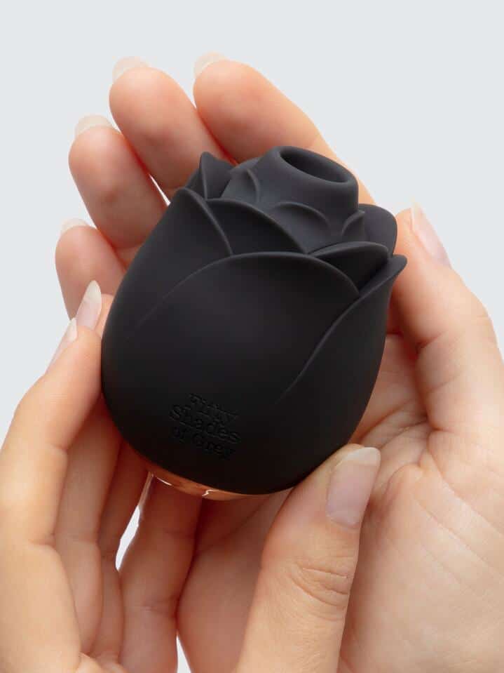 The Fifty Shades of Grey Rose Clitoral Suction stimulator is an object of true beauty, with the most thrilling of intentions. “There’s something about you, though, and I’m finding it impossible to stay away.” – Anastasia Steele. Delicately sculpted, velvet-soft petals surround a powerhouse of delicious suction prowess, elegantly poised to deliver 10 intense pleasure modes, composed of 6 speeds and 4 patterns, straight to your clitoris. Designed for longevity and so that you can enjoy the ripples of intense clitoral pleasure over and over again, the Fifty Shades of Grey Rose Clitoral Suction stimulator is fully rechargeable. Both quietly powered and waterproof too, this rose-shaped beauty is versatile and discreet, making it perfect for intimate moments anywhere. Slather generously with your favourite water-based lubricant for extra pleasurable sensations. Your Rose Clitoral Suction Stimulator comes with a Fifty Shades of Grey storage bag, making it an ideal erotic gift for fans of the books. Part of the Fifty Shades of Grey Official Pleasure Collection approved by author E L James.