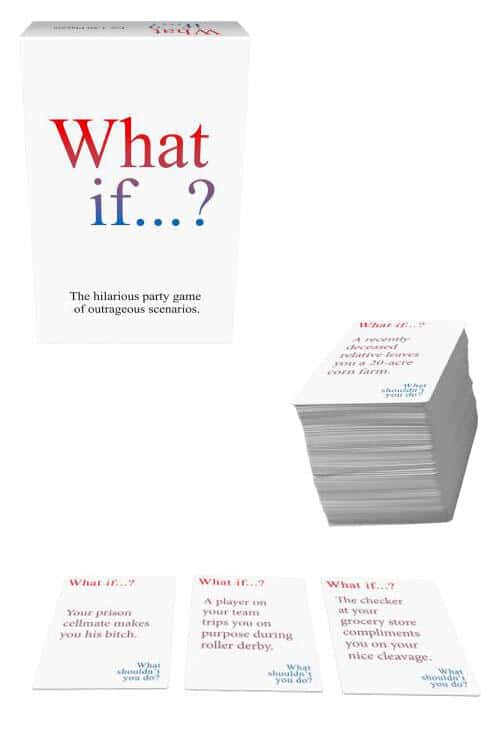 Welcome to What if…? The adult party game of outrageous scenarios that asks you to come up with even more outrageous answers. One player reads out the scenario and two other players compete to provide the funniest answer.