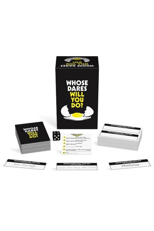 Suitable for three or more players, the Whose Dares Will You Do? board game features 100 cards, each with six actions. Players roll the die to determine their dare on the card.