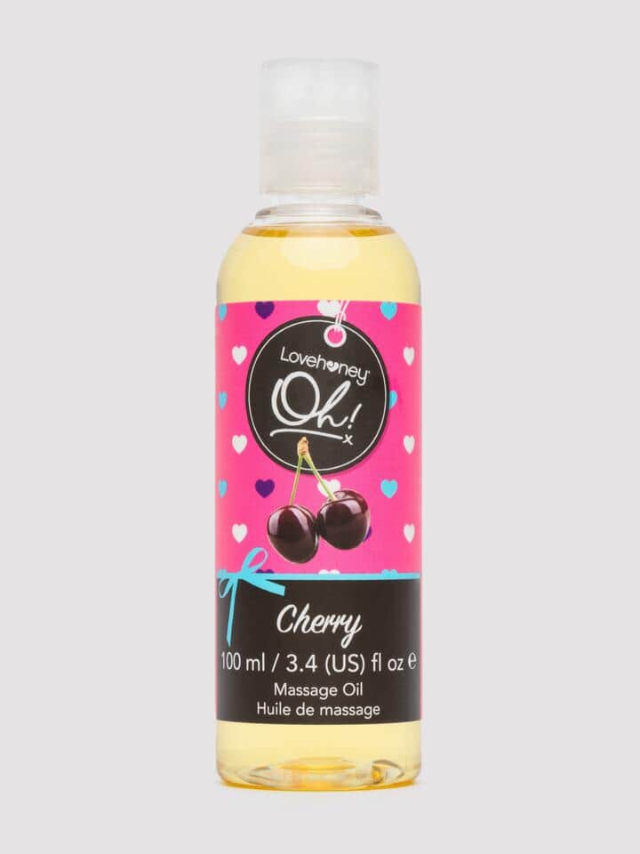 This Lovehoney favourite has gotten even bigger. Delicious in every sense of the word, our 100ml cherry-flavour kissable massage oil boasts the same formula as our 30ml one – just with more to go around. With essential oils that nourish and love your skin, sensual massages and mouth-watering kisses are yours to enjoy. Warm a few drops in your hands and apply it to your or your lover’s skin to release the irresistible fragrance. The urge to immerse yourself in the sweet cherry experience by kissing, massaging and caressing will follow shortly. Lovehoney Oh! is a fun and flirtatious collection of gifts and games, designed to inspire and delight you and your partner in the bedroom – and beyond. Please note: This product is NOT suitable for those with a nut or sesame oil allergy. Ingredients: Prunus Amygdalus Dulcis (Almond) Oil, Vitis Vinifera (Grape) Seed Oil, Prunus Armeniaca (Apricot) Kernel Oil, Cannabis Sativa (Hemp) Seed Oil, Persea Gratissima (Avocado) Oil, Sesamum Indicum (Sesame) Seed Oil, Flavor, Rosmarinus Officinalis (Rosemary) Leaf Oil, Tocopherol, Eugenol.