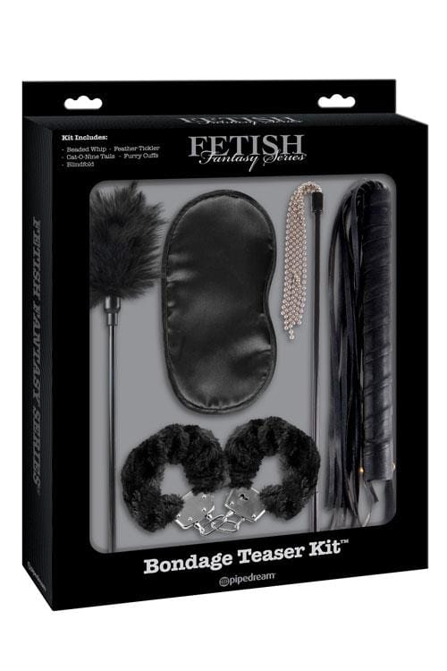 Bring your fantasies to life with this beginners friendly bondage kit from Pipedream. Includes a satin love mask, a beaded whip, a teasing feather tickler, cat-o-nine tails and furry love cuffs. The pleasure possibilities are endless!
