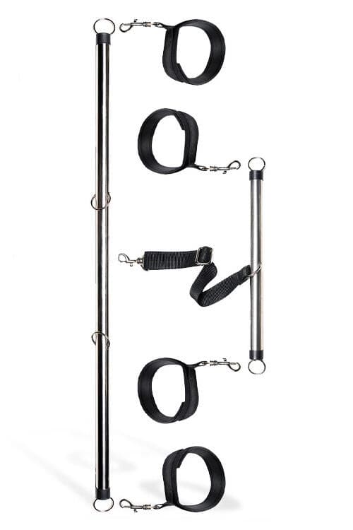 This kinky set includes two metal spreader bars each with two cuffs. Use one bar to keep your arms apart and the other on your legs.
