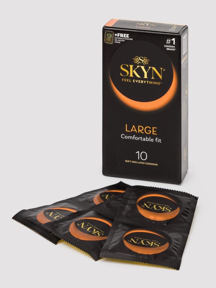 These large, latex-free condoms from SKYN offer comfort and security for the larger member and a more natural feel. Made from SKYNFEEL, a technologically advanced non-latex material, these condoms are larger and longer than the standard size and protect against STIs and pregnancy for fun, safe sex. Perfect for anyone with a latex allergy or who find regular condoms too constricting, they boast a reservoir tip for comfort and reliability, with a nominal width of 56mm. Plus, they’re specially lubricated for long-lasting, enhanced pleasure.