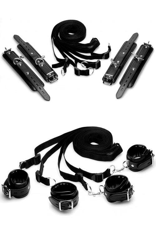 Turn your bed into the ultimate bondage play area with this deluxe restraint kit, including super resistant nylon straps and faux leather cuffs.